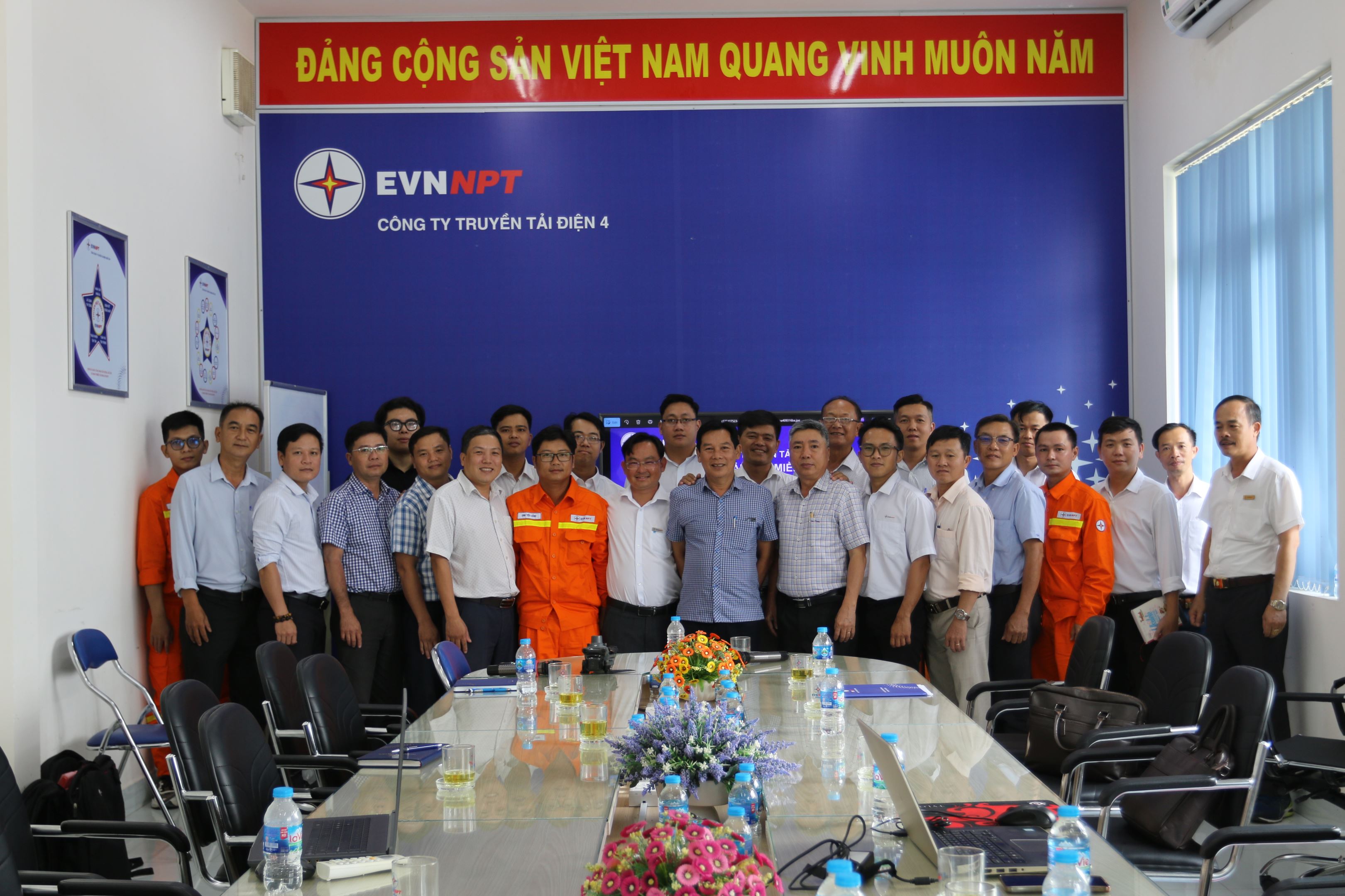 Các đại biểu chụp hình lưu niệm tại buổi bay biểu diễn UAV demo kiểm tra thiết bị tại trạm 500kV Tân Uyên.