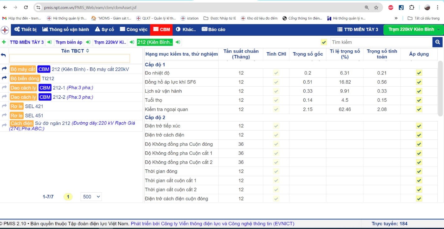 Dữ liệu CBM máy cắt ngăn 212 trạm biến áp 220kV Kiên Bình trên phần mềm PMIS.