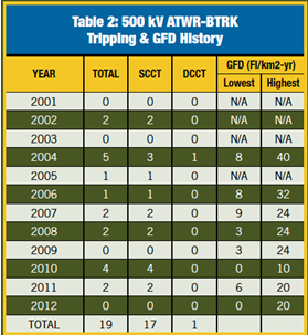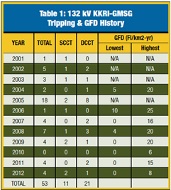Theo hệ thống thông tin trung tâm của TNB về sự cố, số lượt cắt hàng năm từ năm 2001 (cả cắt một mạch lẫn 2 mạch) cũng như giá trị GFD cho 2 đường dây đang khảo sát, cho trong bảng 1 và 2 dưới đây.