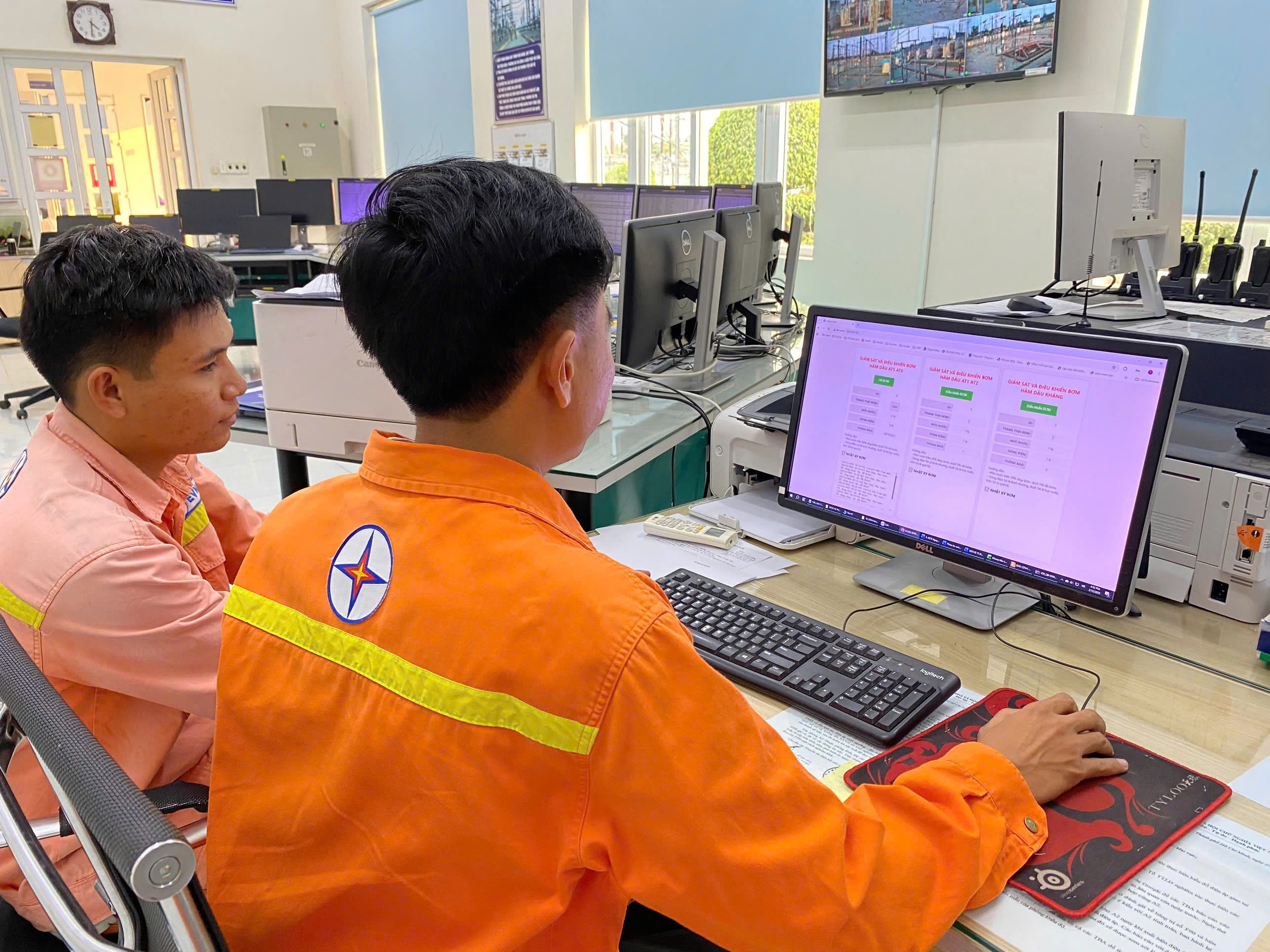 Anh Nguyễn Hoàng Nhật( người đứng phía bên phải) - trực chính Tổ QLVH TBA 500kV Tân Uyên hướng dẫn thực hiện chương trình hỗ trợ phiếu thao tác( sáng kiến năm 2024).