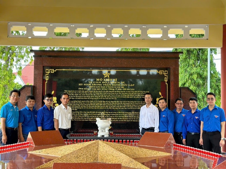 Các đồng chí Đảng viên, đoàn viên chi đoàn Truyền tải điện Thành phố Hồ Chí Minh chụp hình lưu niệm tại Nghĩa trang Liệt sĩ huyện Đức Hòa, tỉnh Long An.