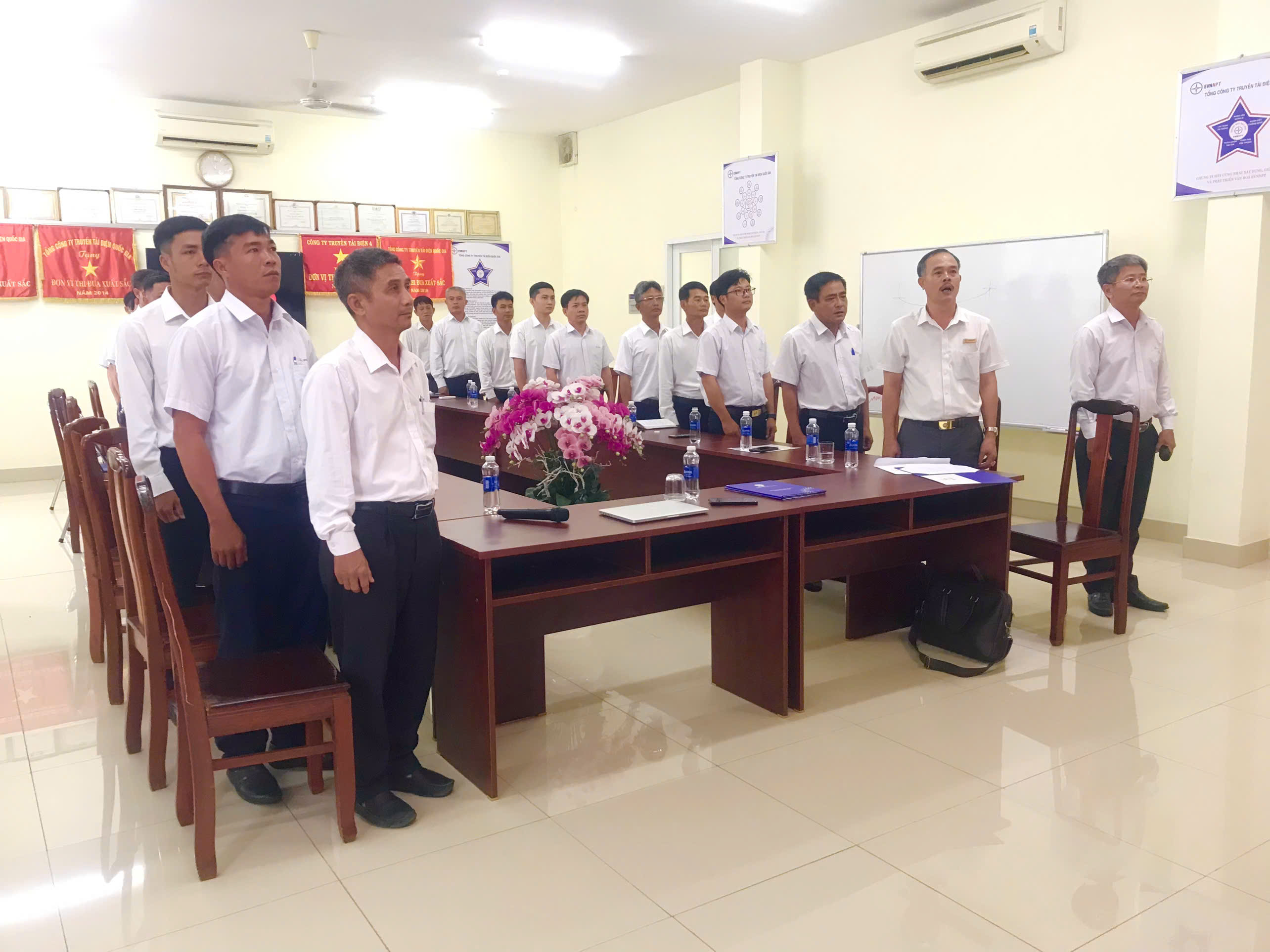 Đồng chí Nguyễn Văn Lịch trao Quyết định chuyển Đảng chính thức cho đảng viên dự bị Đinh Xuân Hòa, Đội Truyền tải điện Bù Đăng.
