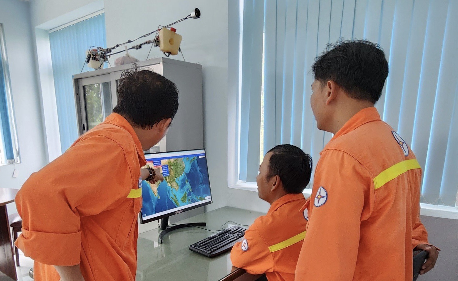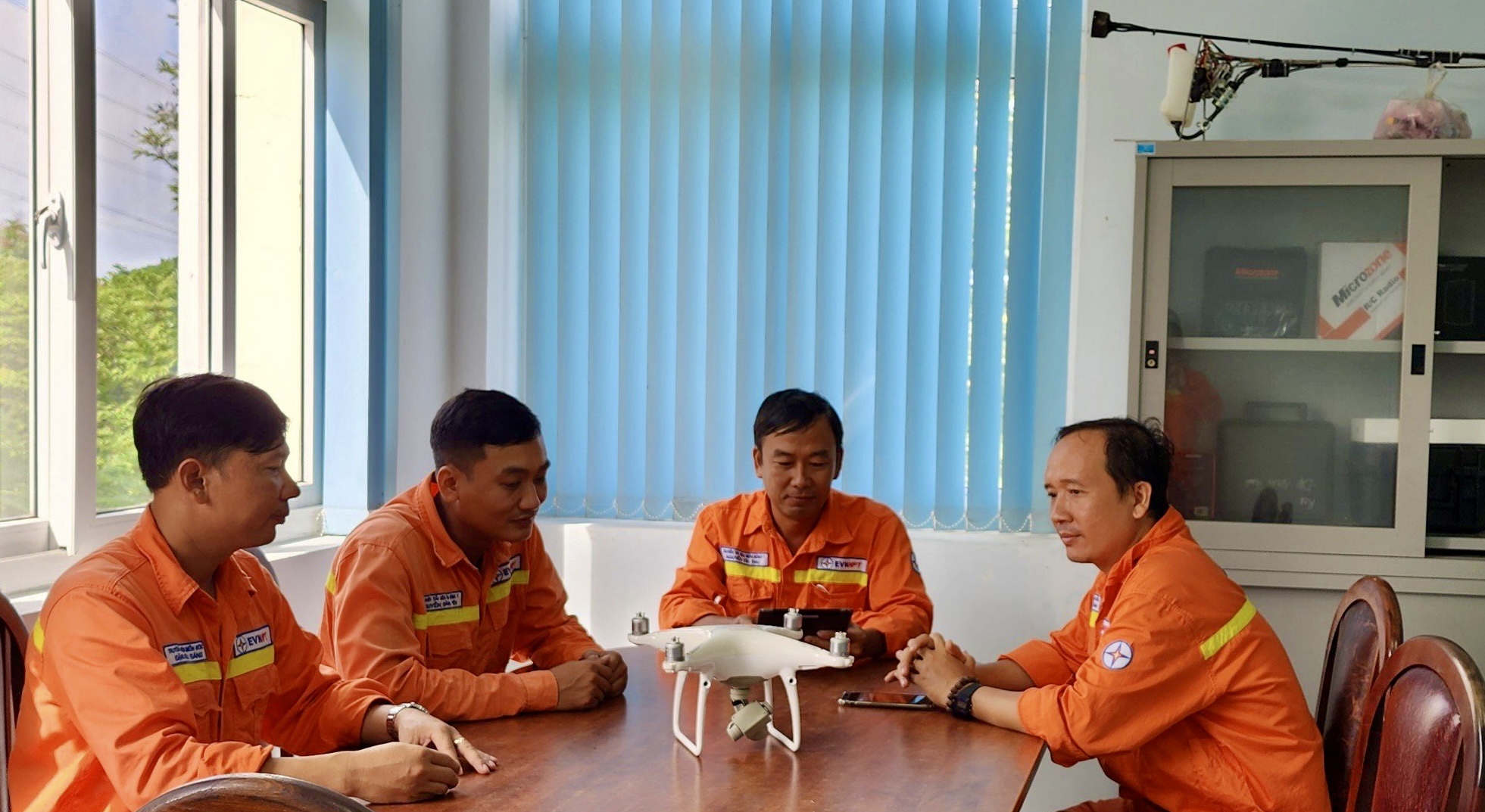 Các thành viên Tổ vận hành ứng dụng Khoa học công nghệ đang trao đổi trong công tác thực hiện bay kiểm tra trên các đường dây 220kV.