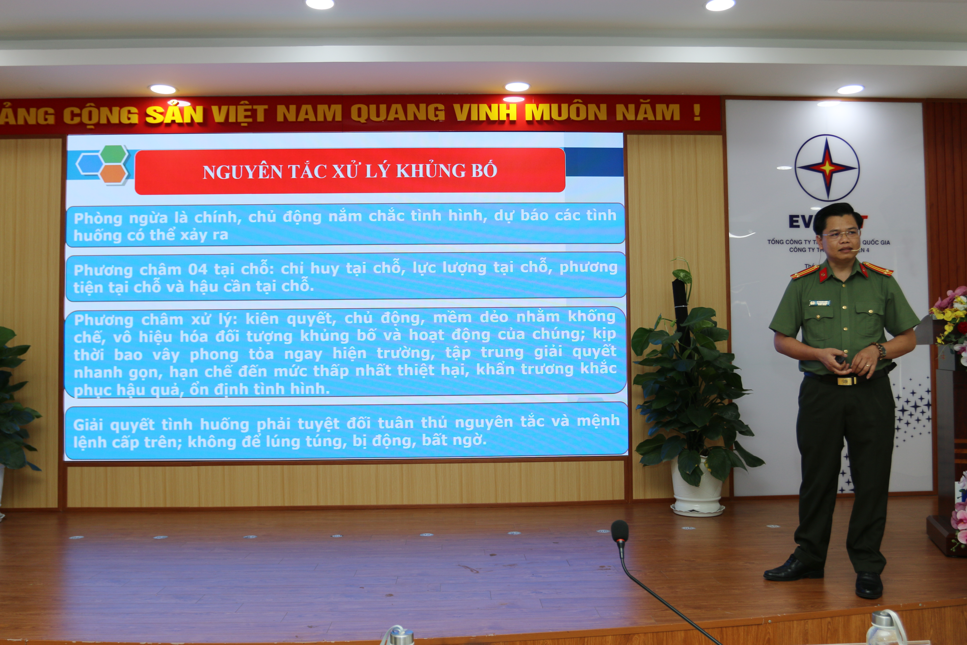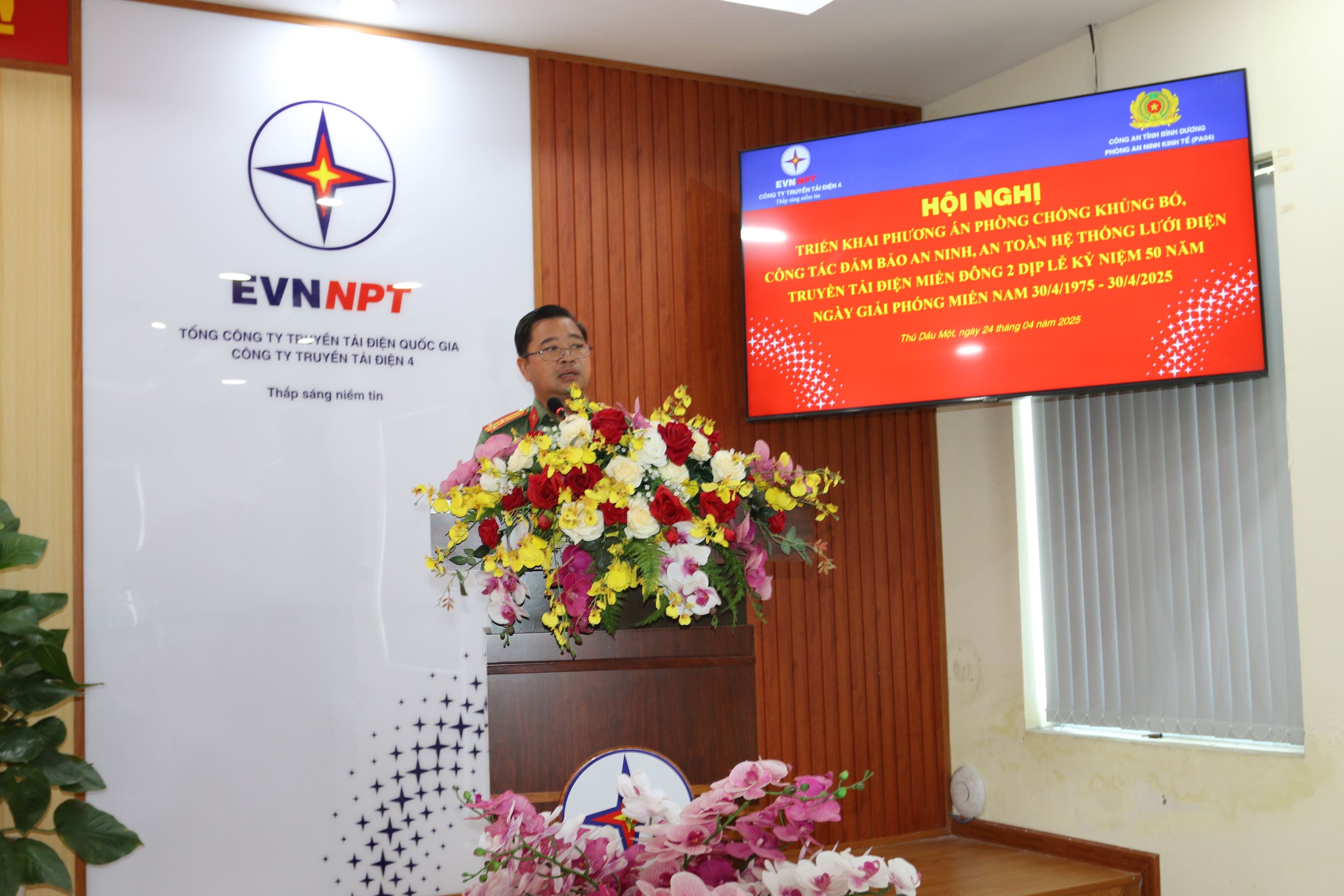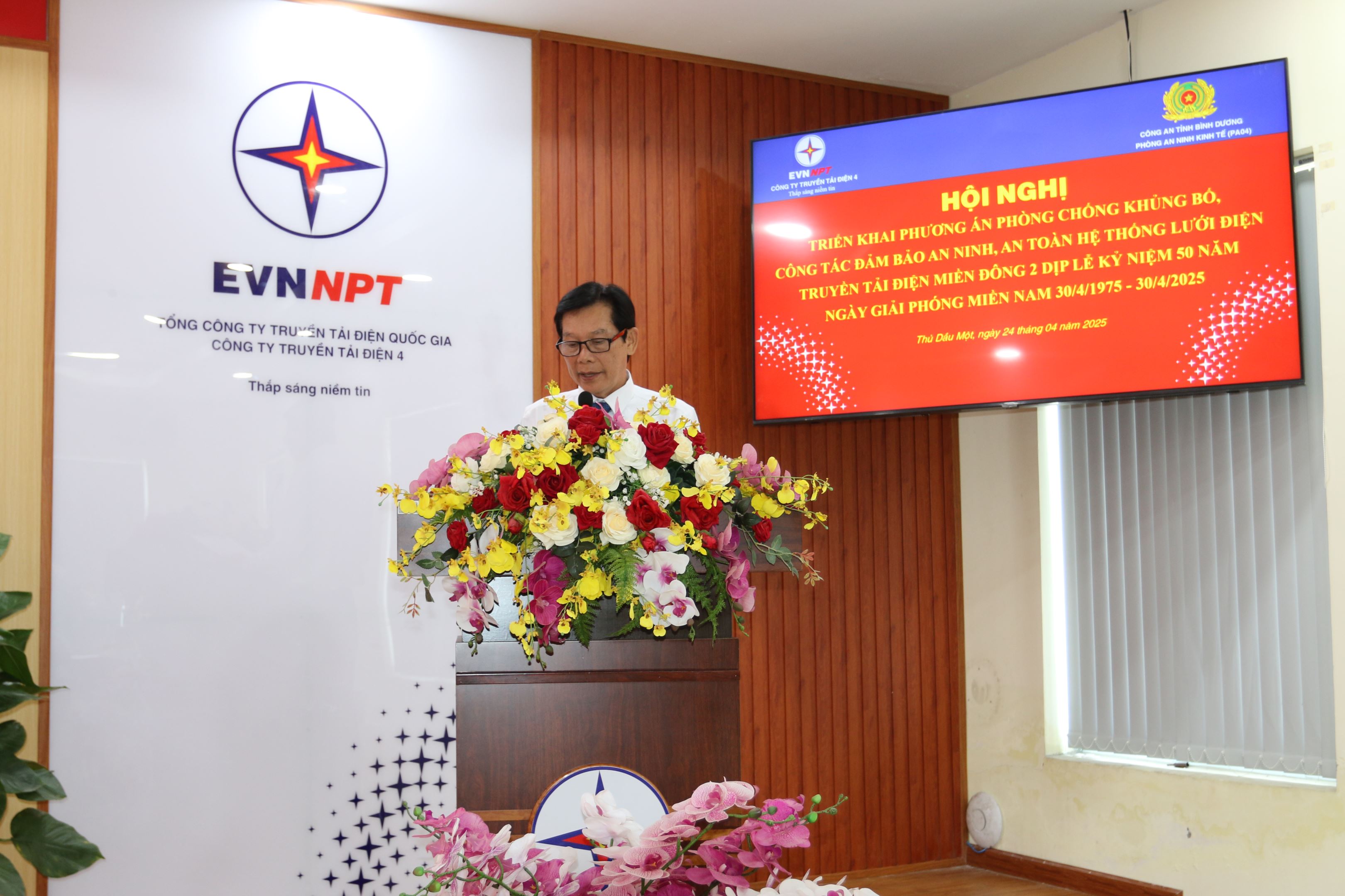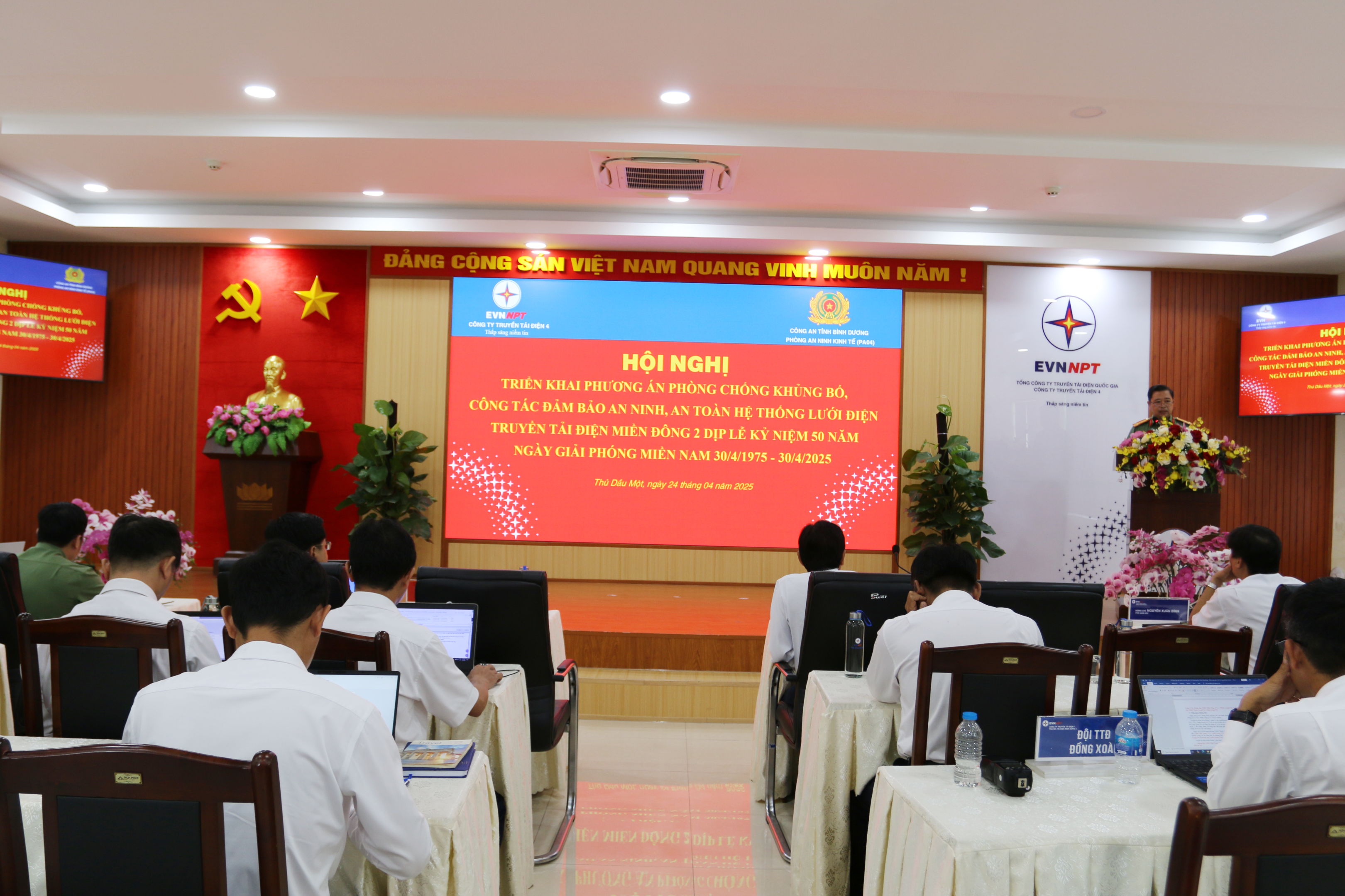 Thực hiện chỉ đạo của Công ty Truyền tải điện 4 tại văn bản số 1416/PTC4-KTTTPC ngày 18/04/2025, được sự thống nhất của Phòng An ninh kinh tế Công an tỉnh Bình Dương, ngày 24/04/2025 Truyền tải điện miền Đông 2 tổ chức Hội nghị Phòng chống khủng bố. Hội nghị có sự tham dự của có Đ/c Thượng tá Bùi Phạm Hải, Phó trưởng phòng an ninh kinh tế (PA04) Công an tỉnh Bình Dương cùng cán bộ chiến sỹ tham gia đoàn công tác; Đ/c Bùi Văn Hoàng - UV BCH Đảng ủy Công ty Công ty truyền tải điện 4, Giám đốc Truyền tải điện miền Đông 2 cùng lãnh đạo các phòng đơn vị trực thuộc tham dự.